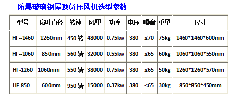 玻璃鋼防爆型負壓風機:主要用于含有“易燃易爆氣體”的車間或工廠的通風、換氣、降溫、排煙霧、排異味、排廢氣、排細微粉塵等用途,成組安裝多臺玻璃鋼防爆型負壓風機還能起到夏季通風降溫效果。如化工廠、酸堿氣體車間、電鍍車間、印刷車間等,該產(chǎn)品具有強悍的排風性能,可用作降溫、換氣、排異味、排煙霧、排空氣中彌漫的細微粉塵、有易燃易爆氣體等,其排風量和性能都和普通玻璃鋼負壓風扇一致只是電機更換防爆專用電機。