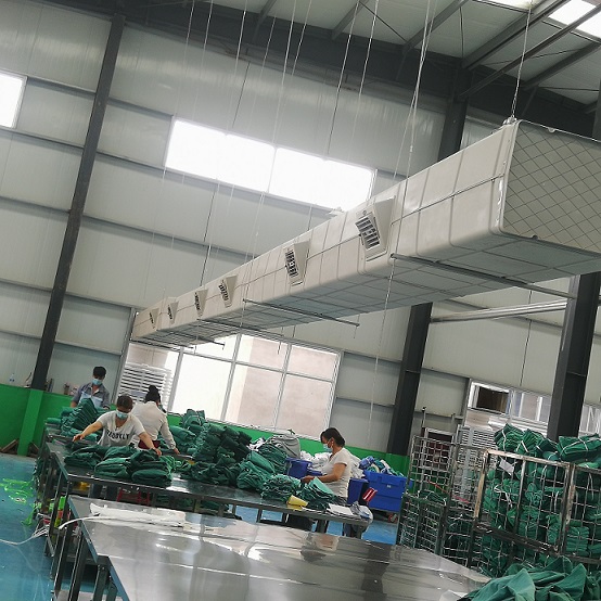 這么多的設(shè)備在一個車間內(nèi),在夏天這樣的高溫季節(jié),車間內(nèi)的溫度是相當(dāng)?shù)母?,如何才能有效的給水洗廠進行降溫呢,我們正常降溫把水洗廠分成若干個區(qū)域,水洗洗滌部分,溫度不高,利用浩風(fēng)冷風(fēng)機直接吹風(fēng)就可以給這部分車間降溫。而燙平,烘干部分采用前面整體式的吹風(fēng)效果就不好了,這部分區(qū)域我們都是采用管道進行送風(fēng)到員工的工作崗位上進行降溫。